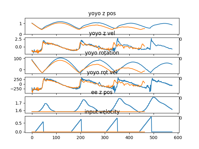To show that the simple controller can inject energy into the yoyo motion, a comparison was performed with the result shown in Figure 3. The yoyo was released without any control for the orange curve, so it died out in three to four cycles. For the blue curve, the yoyo was controlled by the simple controller. It is obvious that the blue curve shows promising trend for playing yoyo.