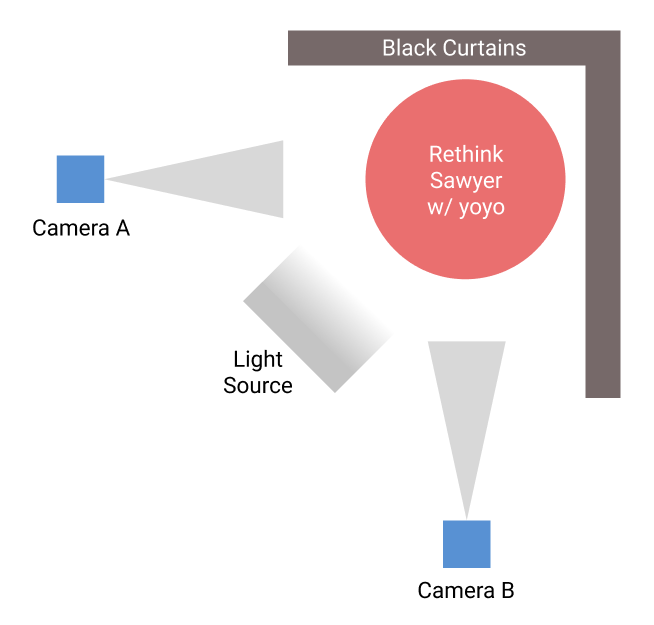 The overall hardware setup consists of two high speed cameras, two black curtains, a lighting source, a Rethink Sawyer robot, and a Duncan Reflex yoyo as shown in Figure below.